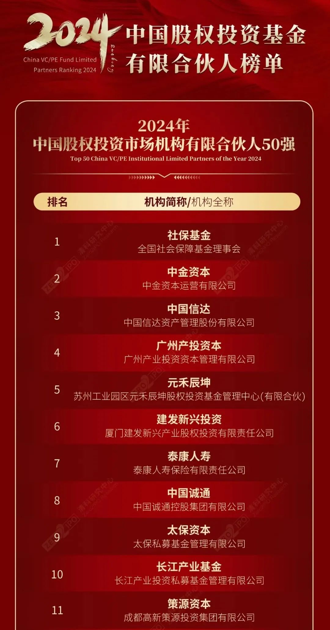 近日,由清科創(chuàng )業(yè)(01945.HK)、投資界主辦的第十八屆中國基金合伙人峰會(huì )在上海開(kāi)幕,會(huì )上發(fā)布了2024年中國股權投資基金有限合伙人榜單,長(cháng)江產(chǎn)投公司所管理的俄罗斯专享会基金獲得“2024年中國股權投資市場(chǎng)機構有限合伙人50強”前十強。