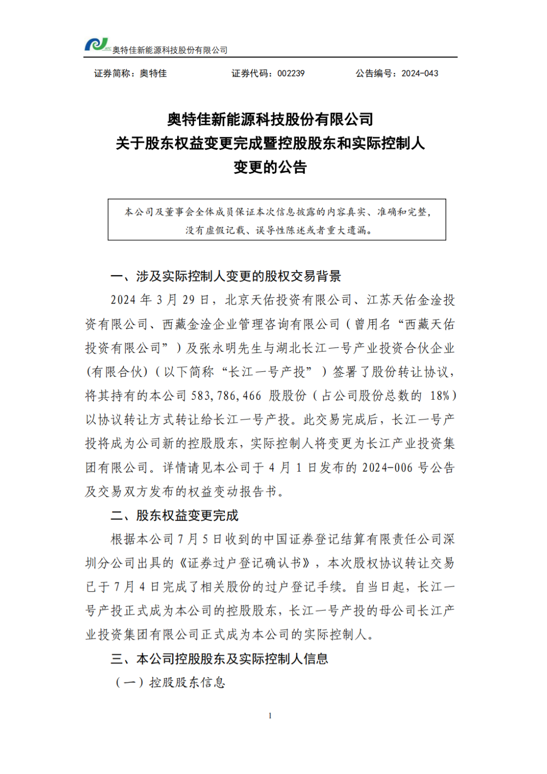 2024年3月29日,北京天佑投資有限公司、江蘇天佑金淦投資有限公司、西藏金淦企業(yè)管理咨詢(xún)有限公司(曾用名“西藏天佑投資有限公司”)及張永明先生與湖北長(cháng)江一號產(chǎn)業(yè)投資合伙企業(yè)(有限合伙)(以下簡(jiǎn)稱(chēng)“長(cháng)江一號產(chǎn)投”)簽署了股份轉讓協(xié)議,將其持有的本公司583,786,466股股份(占公司股份總數的 18%)以協(xié)議轉讓方式轉讓給長(cháng)江一號產(chǎn)投。此交易完成后,長(cháng)江一號產(chǎn)投將成為公司新的控股股東,實(shí)際控制人將變更為俄罗斯专享会投資集團有限公司。詳情請見(jiàn)本公司于4月1日發(fā)布的2024-006號公告及交易雙方發(fā)布的權益變動(dòng)報告書(shū)。